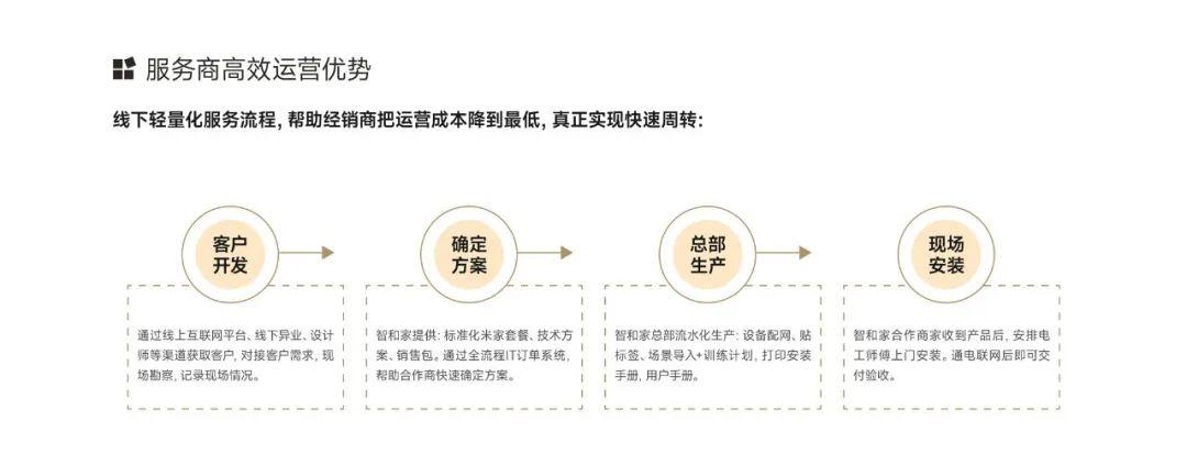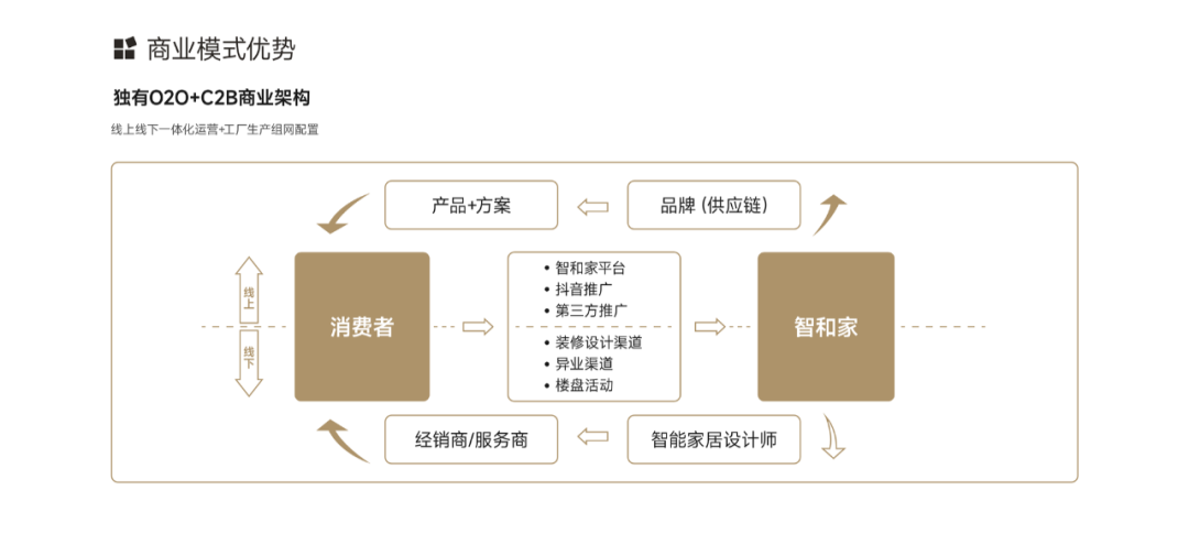 商业模式上比较核心的有两点,一是线上线下一体化运营,二是工厂的这个生产组网的配置,工厂化的生产 。大家可以看上面这个图,左边是消费者,右边是智和家,中间部分的下面就是我们经销商、服务商积智能家居设计师,上面就是我们的产品和方案,以及后面跟着的这些品牌的供应链。