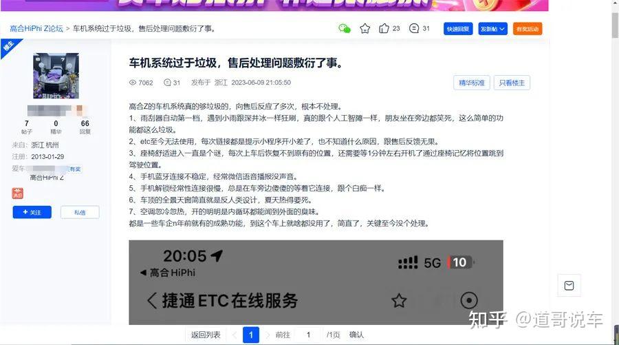 而无论是“虚假宣传”还是“侵害隐私”对于品牌形象来说都相当于无可挽回的损失。除此之外,在论坛等渠道,也偶有高合汽车车主吐槽车辆的质量问题。《道哥说车》编辑注意到,在汽车之家的论坛中,有高合HiPhi Z车主以“车机系统过于垃圾,售后处理问题敷衍了事”为题,揭露了车辆包括雨刮器、ETC、座椅舒适、手机蓝牙连接不稳定、空调忽冷忽热在内的众多问题,并提到“高合Z(HiPhi Z)的车机系统真的够垃圾,向售后反应了多次,根本不处理”。