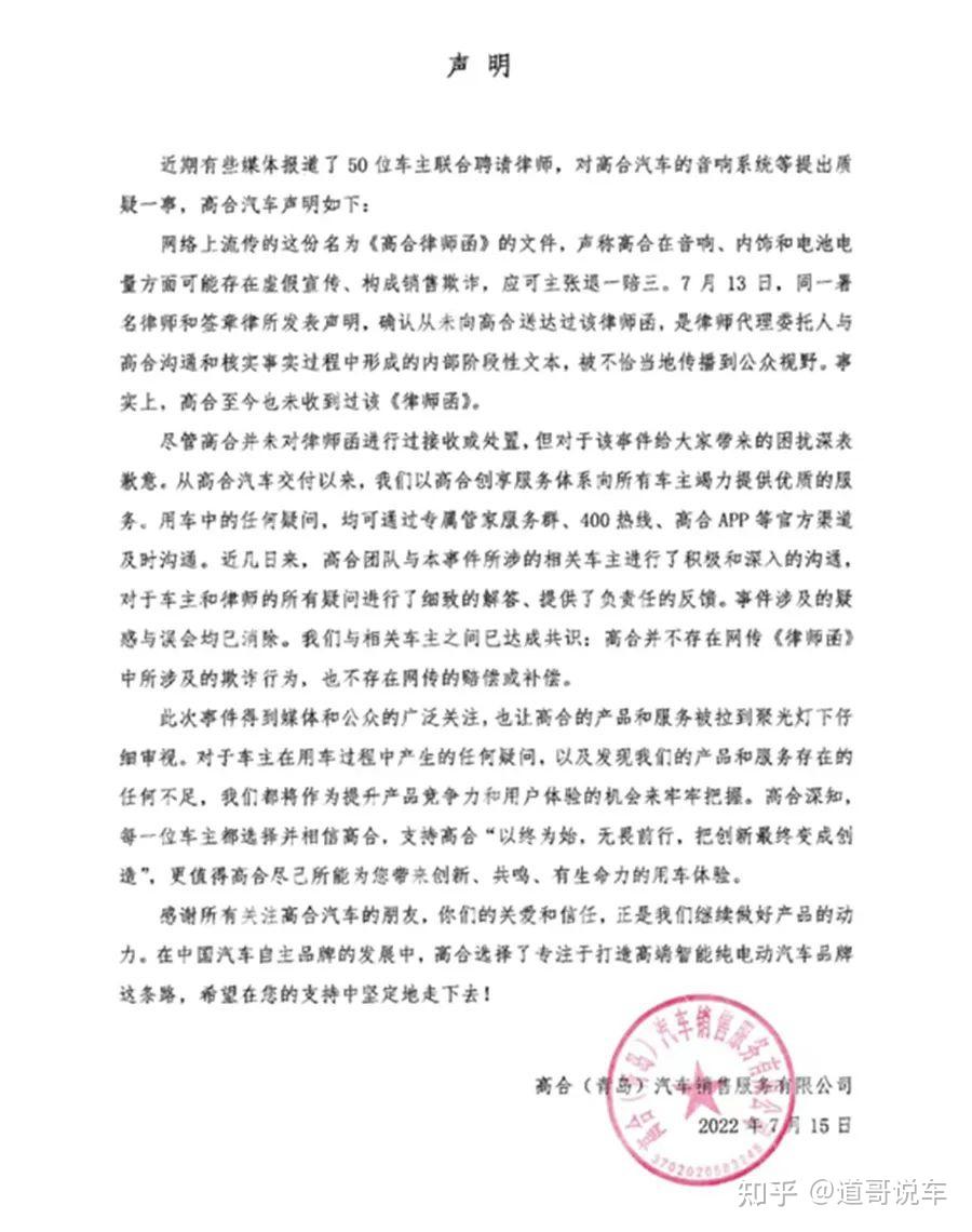 2022年7月,50位车主集中向高合汽车维权,认为高合HiPhi X存在虚假宣传,其中包括音响、内饰材料、电池三个方面: