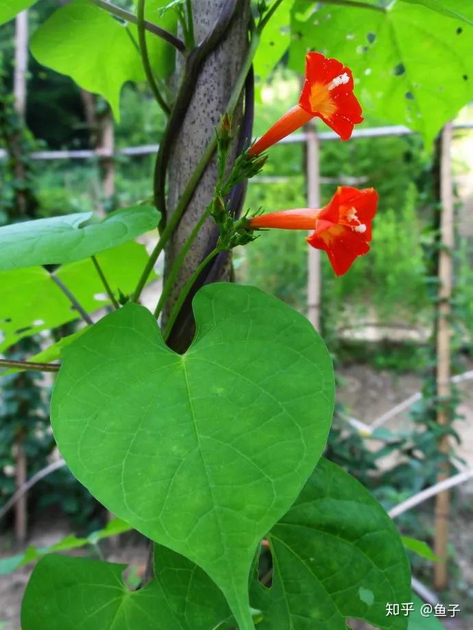 圆叶茑萝 (拉丁学名Quamoclit coccinea Moench),为旋花科、茑萝属一年生草质缠绕藤本,茎较细弱,长1~3米。叶心形,全缘,先端尖。花萼先端具长芒尖。花冠高脚碟状,直径约1㎝,长约3㎝,洋红至橙红色,喉部带黄色;蒴果近球形,种子黑色。花期8月,果熟期9月至10月。