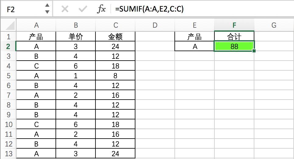 如图:要求在F2统计A产品的总金额