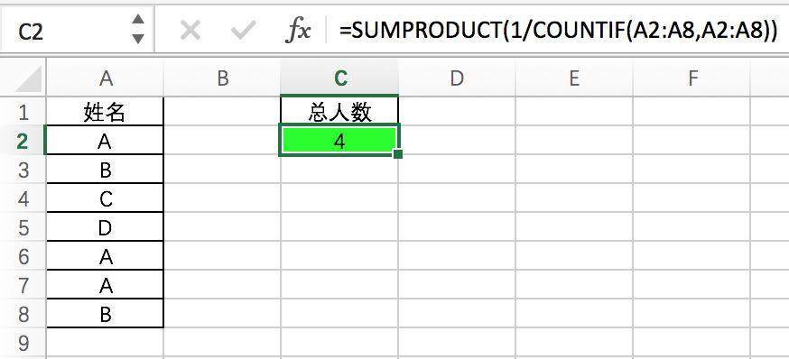 统计不重复的总人数,用COUNTIF统计出每人的出现次数,用1除的方式把出现次数变成分母,然后相加。