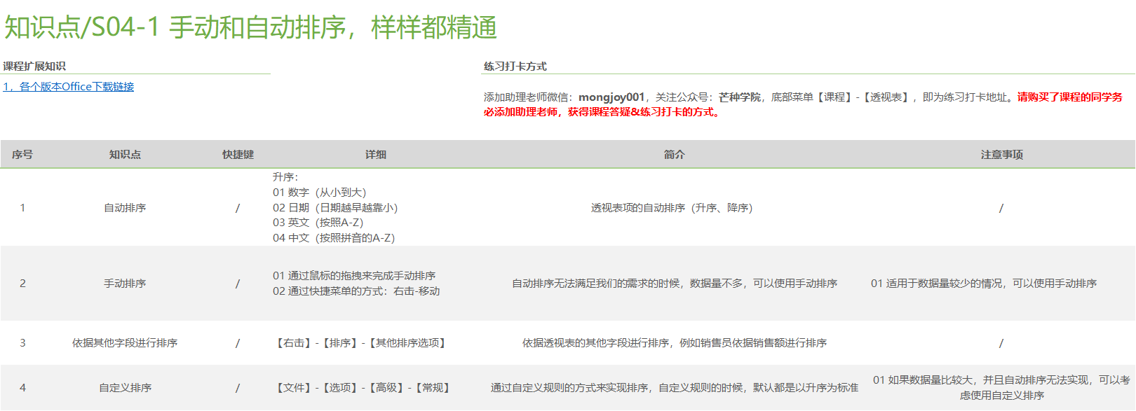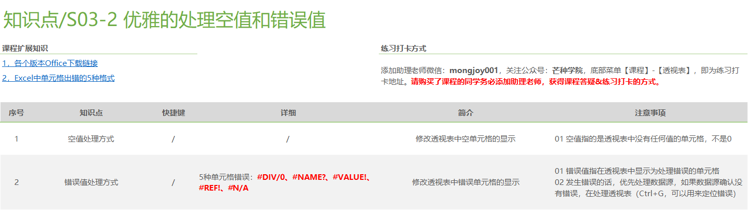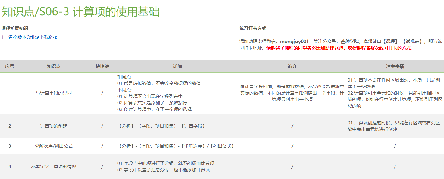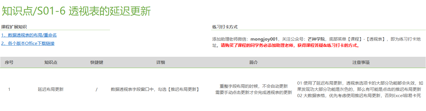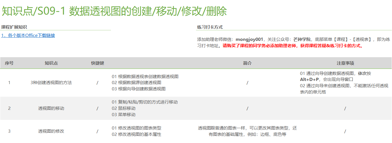 将透视表划分成10个部分来系统学习,如: 软件基础操作(基本术语、重整布局、数据源、字段重命名、延迟布局更新等)、数据刷新、值字段的单元格格式、排序与筛选、透视表分组计算、透视表虚拟字段、透视表动态查询、透视表布局与样式、动态透视图 。