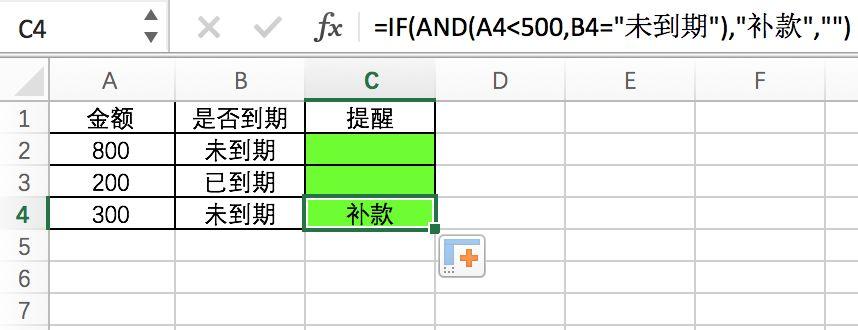 =IF(AND(A2<500,B2="未到期"),"补款",””)