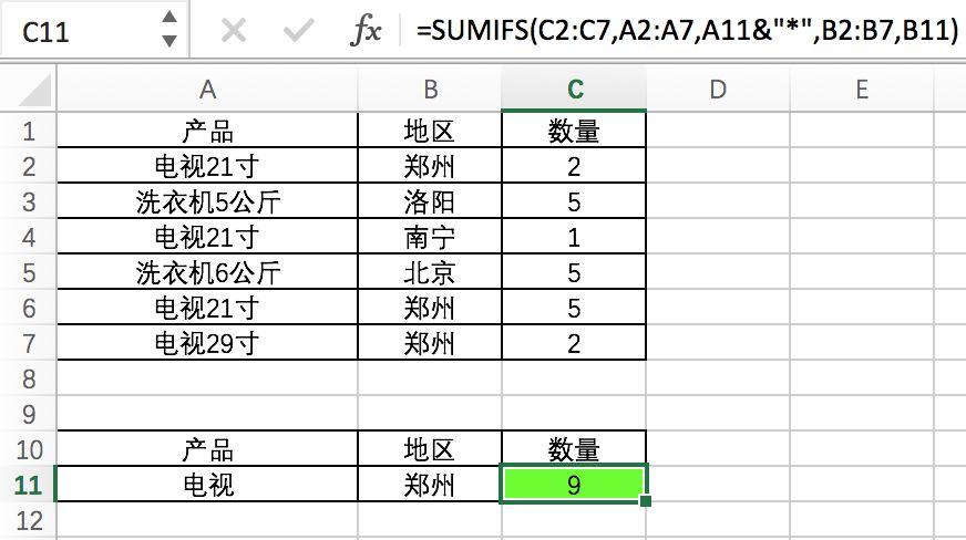如图:统计郑州所有电视机的销量之和=SUMIFS(C2:C7,A2:A7,A11&"*",B2:B7,B11)