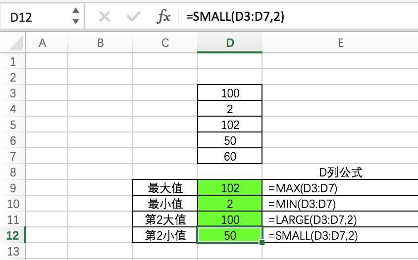 如图:对D列的数字计算最大值,最小值,第2大值,第2小值。