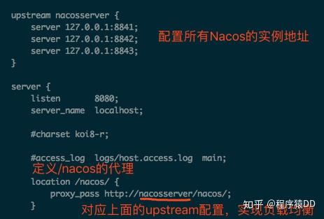 在Nacos的集群启动完毕之后,根据架构图所示,我们还需要提供一个统一的入口给我们用来维护以及给Spring Cloud应用访问。简单地说,就是我们需要为上面启动的的三个Nacos实例做一个可以为它们实现负载均衡的访问点。这个实现的方式非常多,这里就举个用Nginx来实现的简单例子吧。
