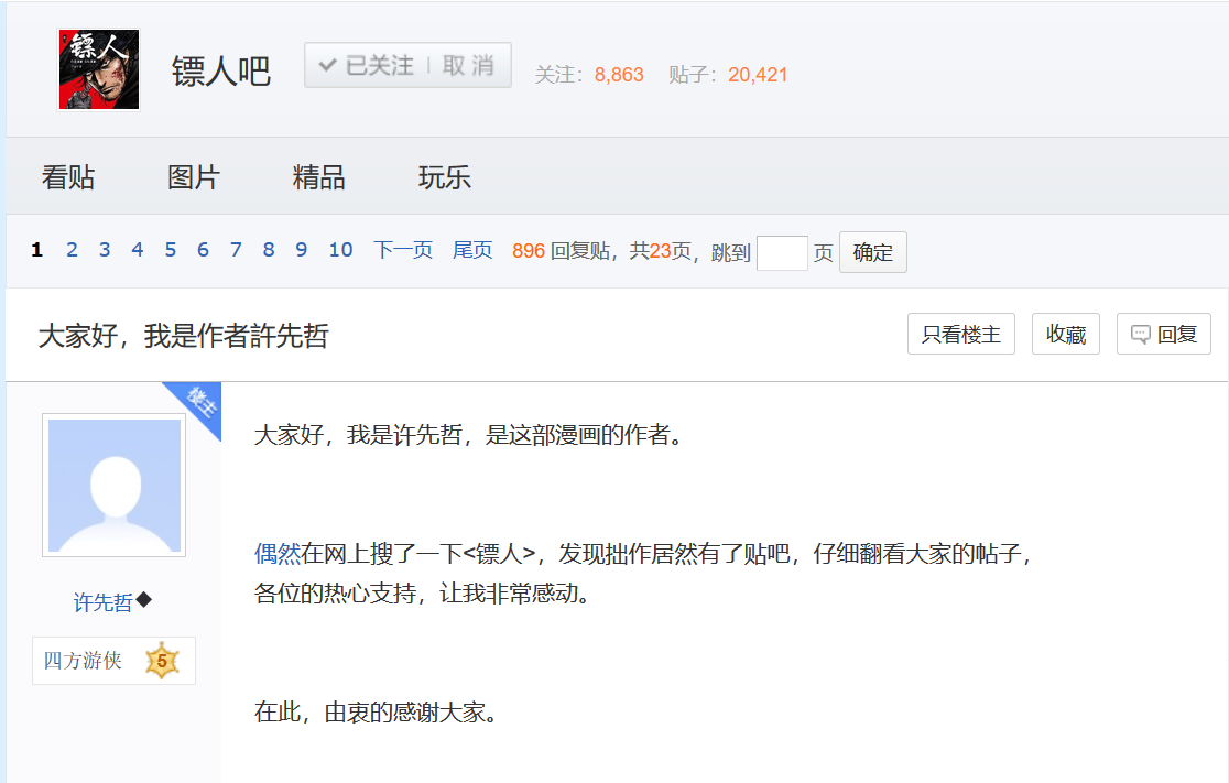 2016年4月1日,愚人节,一位ID为“许先哲”的吧友在一个名为“镖人吧”的贴吧发了一个帖子,以作者的身份开了一个帖子,称自己是《镖人》的作者,用了五年的时间来构思这部作品,是想投入自己的所有一切,认认真真去讲好心目中的这个梦。也就是完成这部历史题材的长篇武侠漫画。