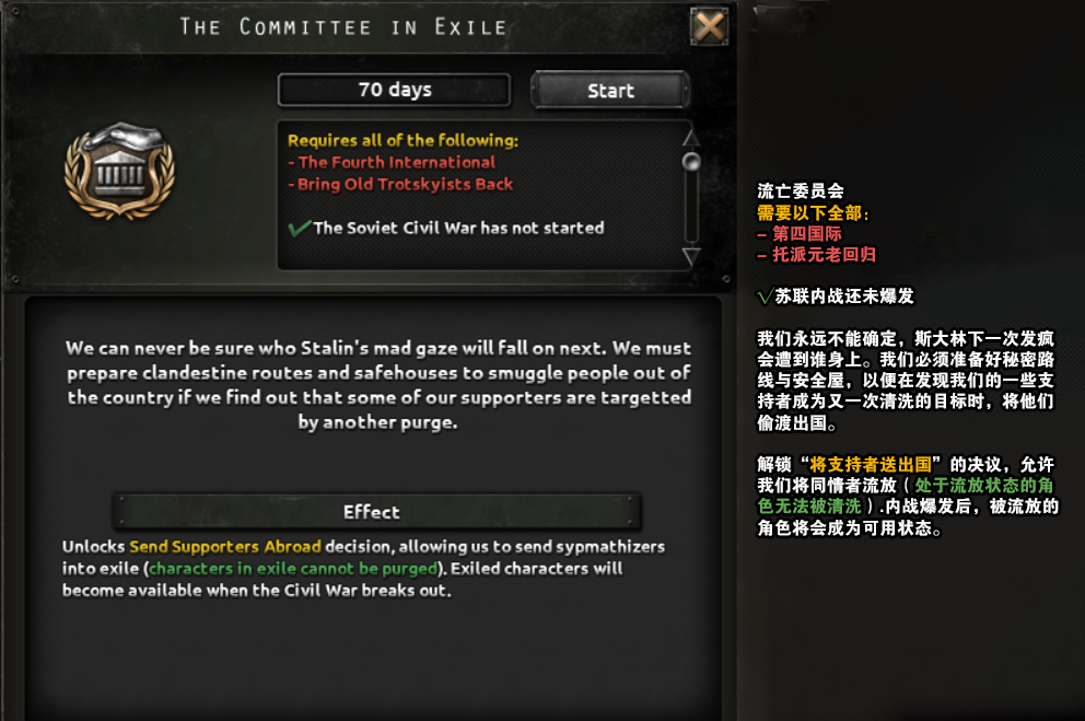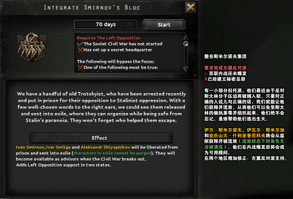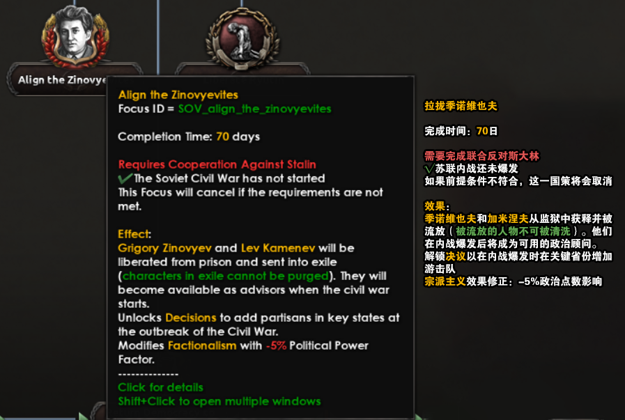 在更深入内战前,让我们先移步一下——不是往后撤(译注:扩展包名双关梗),而是往侧边看看。我曾说过在国策树里把右派和左派放在一起是有原因的。这个原因就是,如我之前所说的那样,结盟关系是在不断变化的。如果你希望的话,你可以加入反对斯大林的势力,并与季诺维也夫和加米涅夫组成联盟。