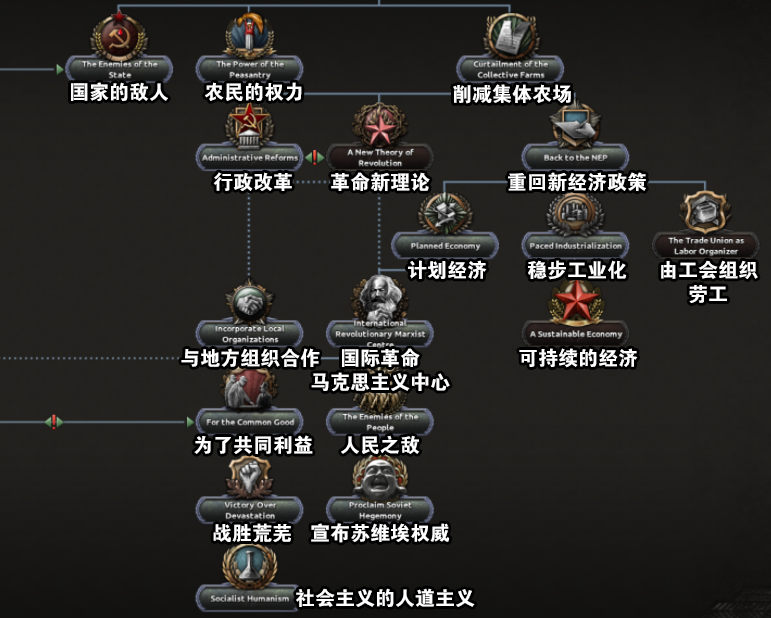 如果你作为两个共产主义分支路线的某派打赢了内战,你基本上可以做斯大林能做的所有事——除了已经被锁定的在“中间派”之后的国策。大部分工业和军事国策仍然有效——大多数外交政策也是如此。