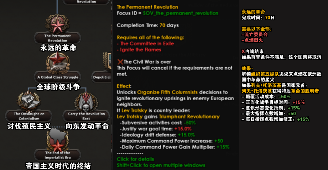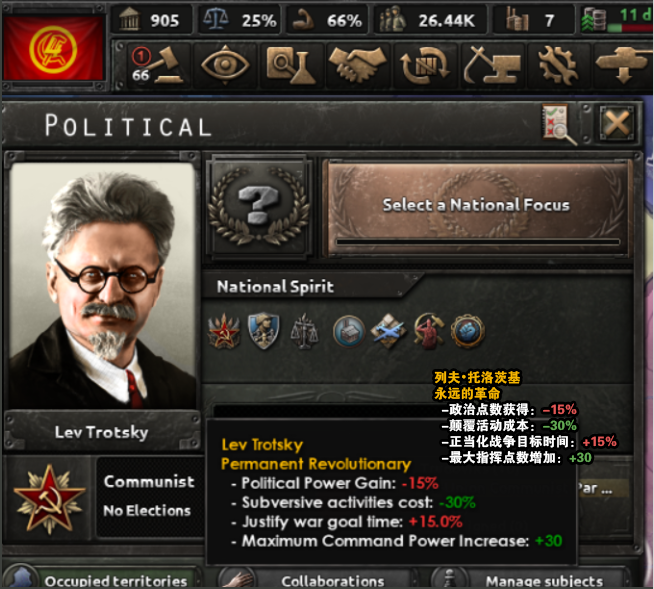如果托洛茨基是国家元首,当你走完这条国策时他的特质将得到升级。