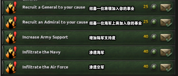 这一国策树中(非常)重要的另一部分就是帮助你实际准备应对内战的国策。你可以开始渗透军队,争取在战争开始时获得红军/红海军/空军的大部分控制权,为了你的事业保护更多的陆军及海军将领。或者,你也可以直接将斯大林的注意力转移到军队上,让斯大林瞄准军队而非你的政治领袖,从而在摊牌前削弱斯大林自己的力量。