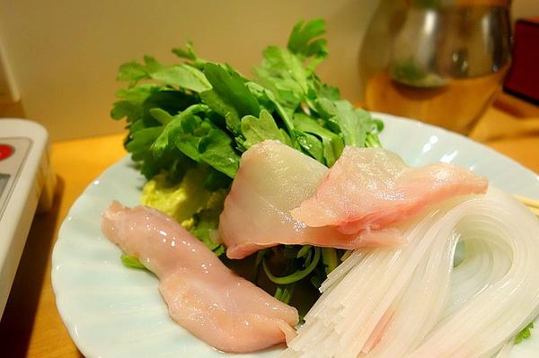 到了河豚火锅的环节。唔,这股鲜味儿是怎么回事。连煮过河豚肉的汤都带着鲜味,一起下锅的蔬菜和粉也变得更好吃了。