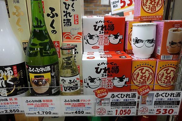 除了常见的河豚料理,唐户市场内的一些土特产店还出售各种河豚食品。如河豚鱼干、河豚鱼鳍制作的酒、河豚肉制成的竹轮等。尝过新鲜的河豚料理后,还可以挑上一些特产带回家。我试了一瓶瓶河豚鱼鳍酒,但喝过后觉得鱼腥味未免有些过重。
