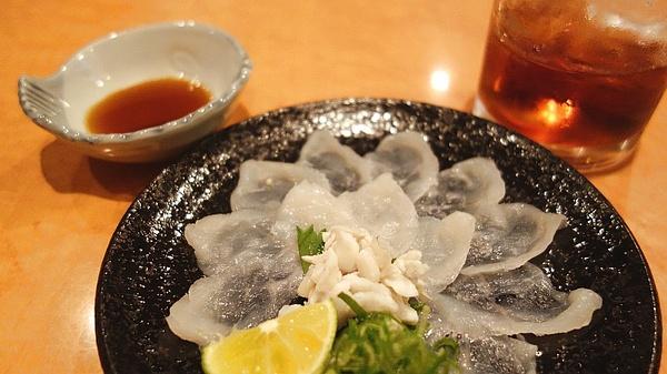 和店里的小哥聊得投缘,小哥端上来一盘形似内脏的东西,豪爽地说:河豚肝,送你吃的。我也没多虑,当下便夹起来生吃了一片。牙齿才刚将它咬开,肝脏的油脂香味就迅速地充盈了整个口腔。小哥说,这肝脏用来涮火锅也行。我试了试,但还是觉得生吃河豚肝的美味更让人难忘。