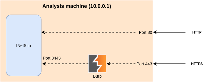 为了能够分析SSL流量,我们还需要运行Burp。我们将作为INetSim前面的透明代理运行它。当受害者机器将启动SSL连接时,它将首先进入Burp,然后将其委托给INetSim。此部分不是强制性的:如果您现在不需要拦截SSL流量,请跳到下一部分。