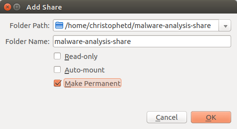 在运行分析计算机的VirtualBox中,转到 设备>共享文件夹>共享文件夹设置。创建一个新的共享文件夹,选择要映射到的主机操作系统的本地文件夹,然后选择一个名称。选中该复选框以使其成为永久性。