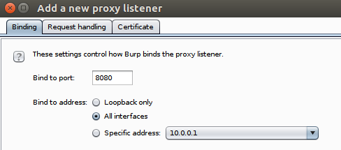 在Burp中,在端口8080上添加新的代理监听器,监听所有接口(选项卡 代理>选项>按钮 添加):