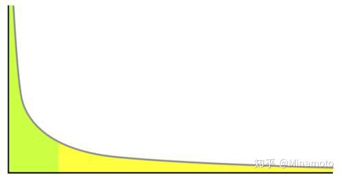 比如这绿色的部分,就是头部,而黄色的部分则是尾部,绿色部分的x所取的区间非常小,但所占的面积却非常大,故有人称20%的人占据了80%的财富,又称二八定律。