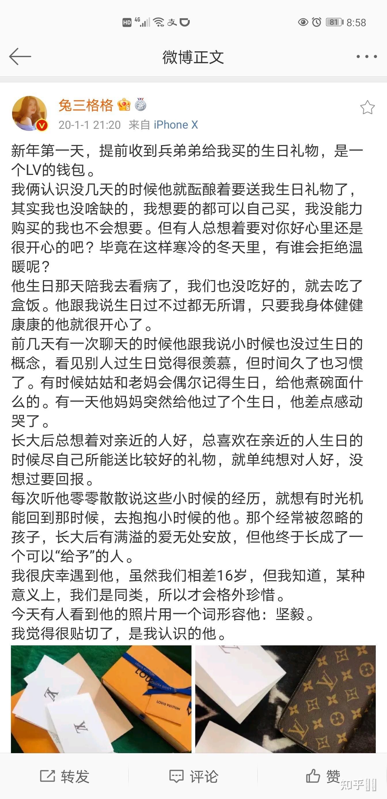 看看微博投稿,兔三格格既然那么喜欢记录生活,那么和兵弟弟小男友的“爱情”细节,大可不必删除吧?让一个20几岁的男孩子用全部津贴给你买LV,你就那么缺?