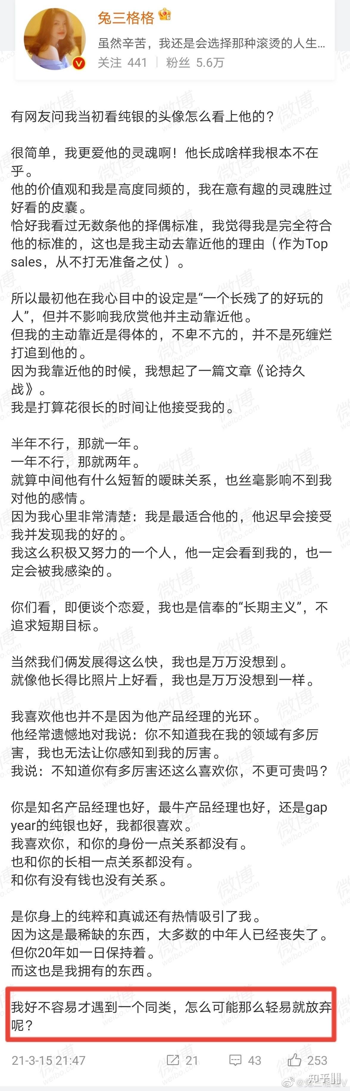 作为一个路人,既不是纯银的粉,也不是兔三格格的粉,为什么要锤这对微商情侣呢?起因是3月在微博看到关注的大V祝福他们相爱,跟着过去看热闹,也觉得挺甜,心里对他们还有祝福,后边越看越觉得画风不对。