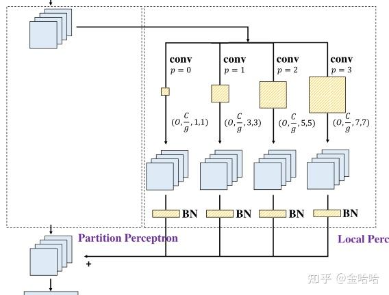 局部信息也就是前面提到的,卷积可以获得但全连接不能获得的信息。在训练模块中,依然使用的是卷积操作。对进来的特征图,分别进行卷积核为1,3,5,7的分组卷积,得到相对于的特征图,最后合并起来。并与Partition Perceptron的输出相加。