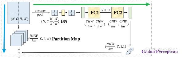 顾名思义,Global Perceptron就是用于提取全局信息的模块。输入进入之后,分成了两条线。蓝线的操作就是一个reshape感觉,本质上就是将图片分patch,然后叠加在bathsize上面。但是直接这么做似乎缺乏了patch之间的相关性。于是就有了绿色的这条支路,将原图进行pooling,使得大小为patch的数量,也就是一个patch对应1个点。然后进行一系列操作。最后叠加到蓝线的输出中。