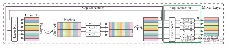 图中,紫色框框就是token-mixing MLPs,绿色框框是channel-mixing MLPs。token-mix无非就是使得不同像素间有通信,channel-mix就是使得不同的channel间有通信。作者也提到了channel-mixing MLPs类似于1x1的卷积,token-mixing MLPs类似于卷积核为n的卷积。