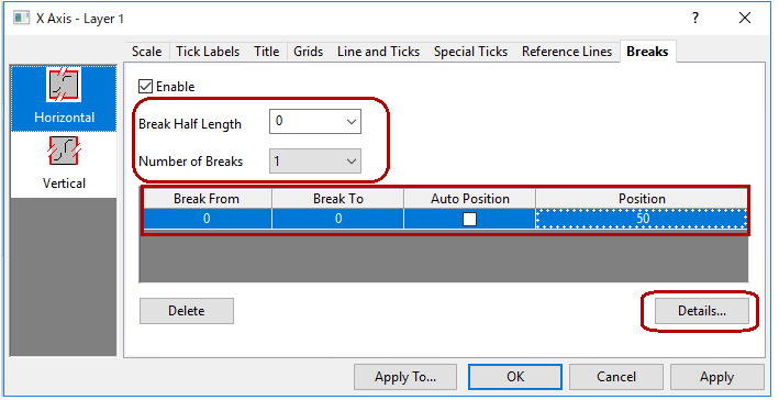 2) 在Axis 对话框的 Breaks 选项卡,同时设置 Break From 和 Break To 可以改变可以断点在X轴上的刻度位置,在这个例子中设为0,。 此时,Break From 和 Break To 的值相同,那么断点间隔为零。 此外,如果要将断点位置放在 X 轴中间,你可以取消勾选 Auto Position 复选框,并在Position 下输入 50 。你也可以通过点击 Details… 按钮,设置轴断点后的刻度。