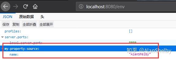 然后浏览器访问 http:// localhost:8080/env ,可以看到以下信息,表示我们自定义的配置成功了:
