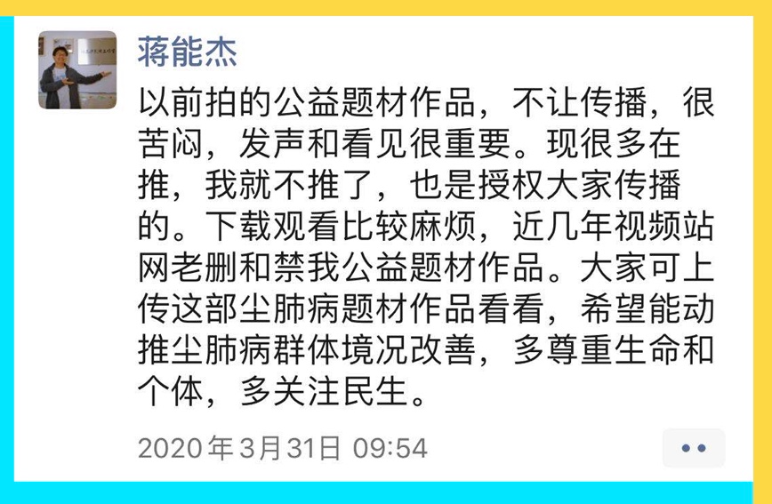 最新这部记录尘肺病的新作也是聚焦家乡的故事,在传播时总被屏蔽,所以蒋能杰常常需要更换链接。
