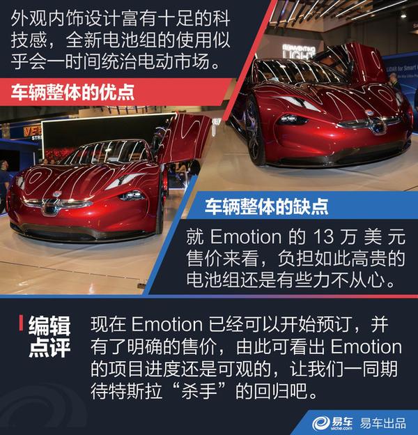 Emotion搭载了一套145Kwh的电池组,将拥有能够超快速充电的电池,9分钟就可以完成充电,续航距离可达到约201公里。在完全充满电的状态下可续航距离可超640km。最高速度可达260km/h。