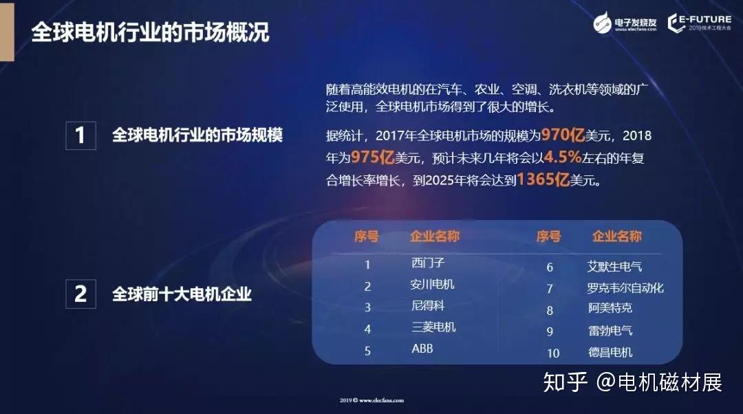 随着高能效电机在汽车、工业、农业、机器人、空调和洗衣机等领域的广泛使用,全球的电机市场得到了很大的增长。据统计,2017年全球电机市场的规模为970亿美元,2018年为975亿美元,预计未来几年,电机市场还会以4.5%的年复合增长率持续增长,到2025年将会达到1365亿美元。