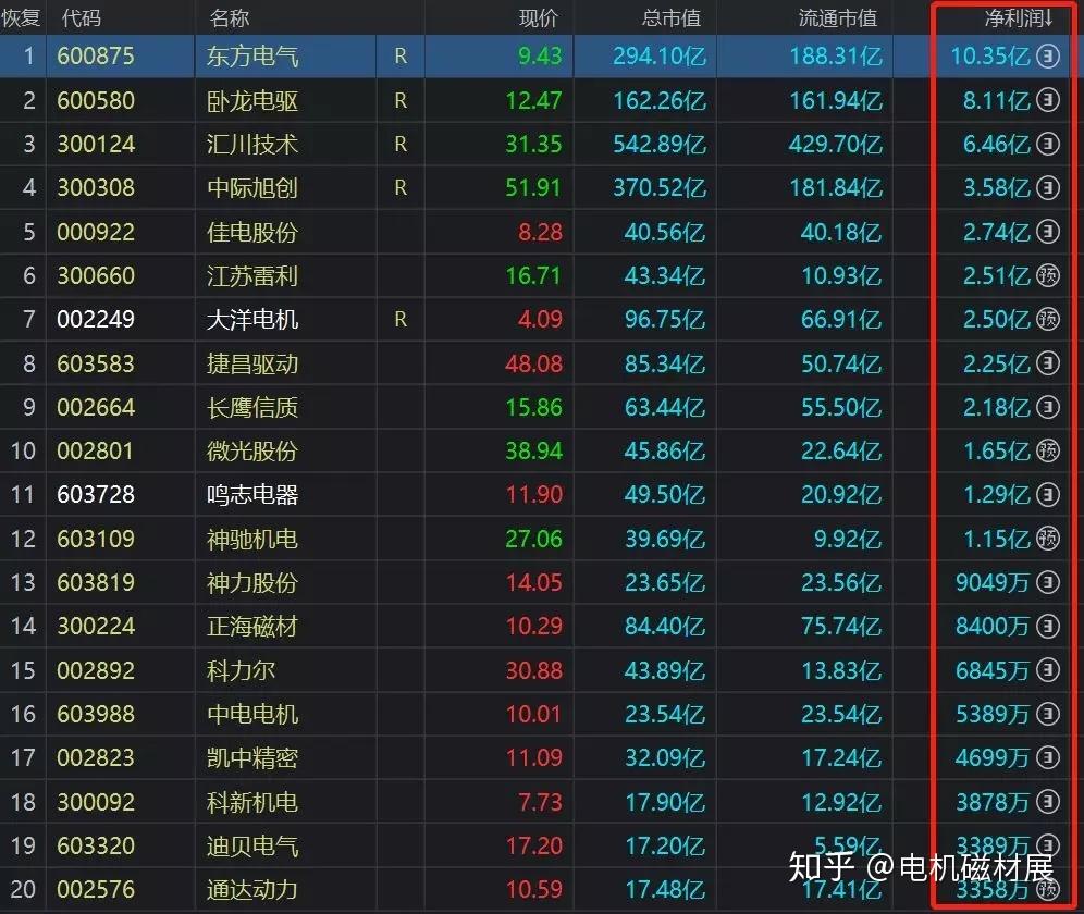 图3:中国沪深A股上市的电机行业企业净利润排名前20(来源:同花顺,电子发烧友)