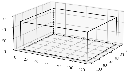 from matplotlib import pyplot as pltimport numpy as npx, y, z = 0, 0, 0dx, dy, dz = 100, 120, 50k = 20fig = plt.figure()ax = plt.axes(projection='3d')# ax.set_axis_off()xx = [x, x+dx, x+dx, x, x]yy = [y+dy, y+dy, y, y, y+dy]kwargs1 = {'linewidth