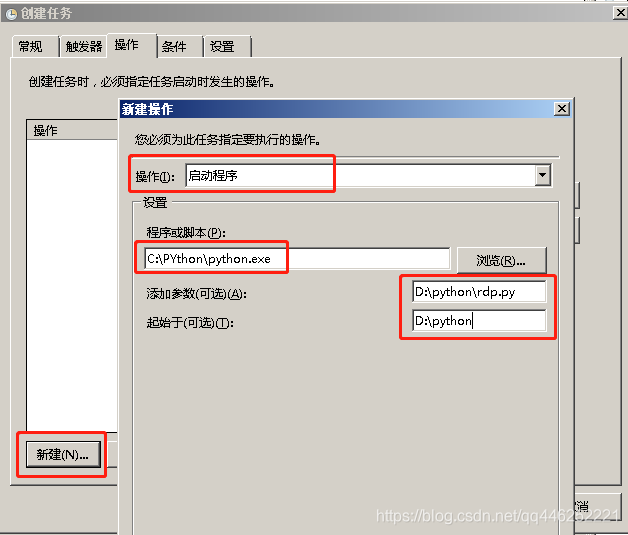 4.设置“操作”,如下图所示,输入python.exe的路径和脚本的完整路径