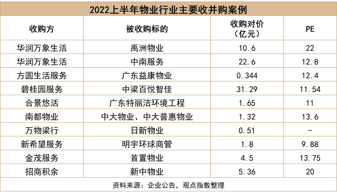 上半年,行业收并购市场的热潮仍在延续。据观点指数统计,2022年上半年主流物企发生收购案20余起,涉及金额超80亿元(去年同期130亿),而2021年全年上市物管企业主动披露并购案例达54起,涉及金额超过350亿元。