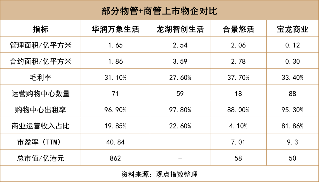 龙湖智创生活则打包了龙湖旗下物业服务与商管平台共同上市,这种打包上市方式在目前物管行业中已不少见,华润万象生活、宝龙商业、正荣服务等都是物管+商管的融合平台。
