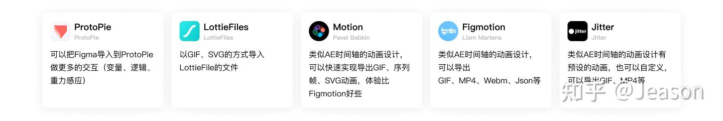 在使用 Figma 之前,可能会由 Photoshop 转向 After Effect、XD 等软件制作动效,如果是 Sketch 流则会有更多的选择可以导入 Principle、Flinto、Protopie、Framer 等工具,Protopie 和 Framer 在动效设计上都是一个不错的选择。