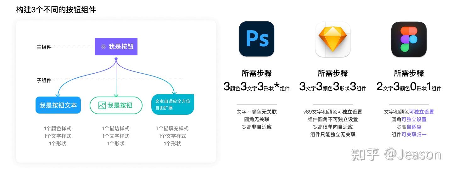 - Figma 得益于原子化的样式,只需要建立2种文本样式,3个颜色、0个形状,通过建立1个基础组件就可以把三个按钮关联归一。其中文字和背景边框等样式可以独立设置,按钮的形状可以直接交给圆角独立设置,配合AutoLayout可以做到完美宽高自适应。