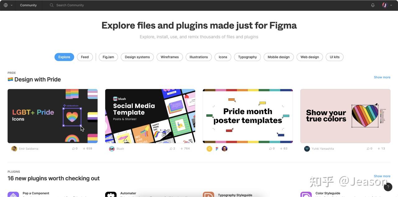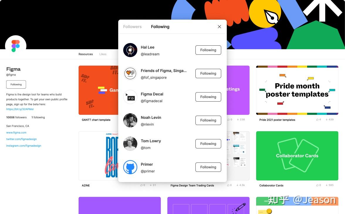 Figma 的社区集合了文件、用户、插件,在这里你可以找到很多优秀的设计范例,优秀的高玩用户,通过高玩关注 去看他关注了谁,站在巨人的肩膀上。