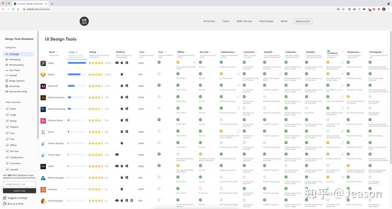 根据 UXTools 用户体验工具调查报告显示,Figma 在国外有逐渐攀升的趋势。Figma 的用户量已经反超了 Sketch, 一举在 UI Design / Protoping / User Flow / Hand Off / Design System / Versioning 拿下排名第一 , 在 WhiteBoard 中 FigJam 排名第二。
