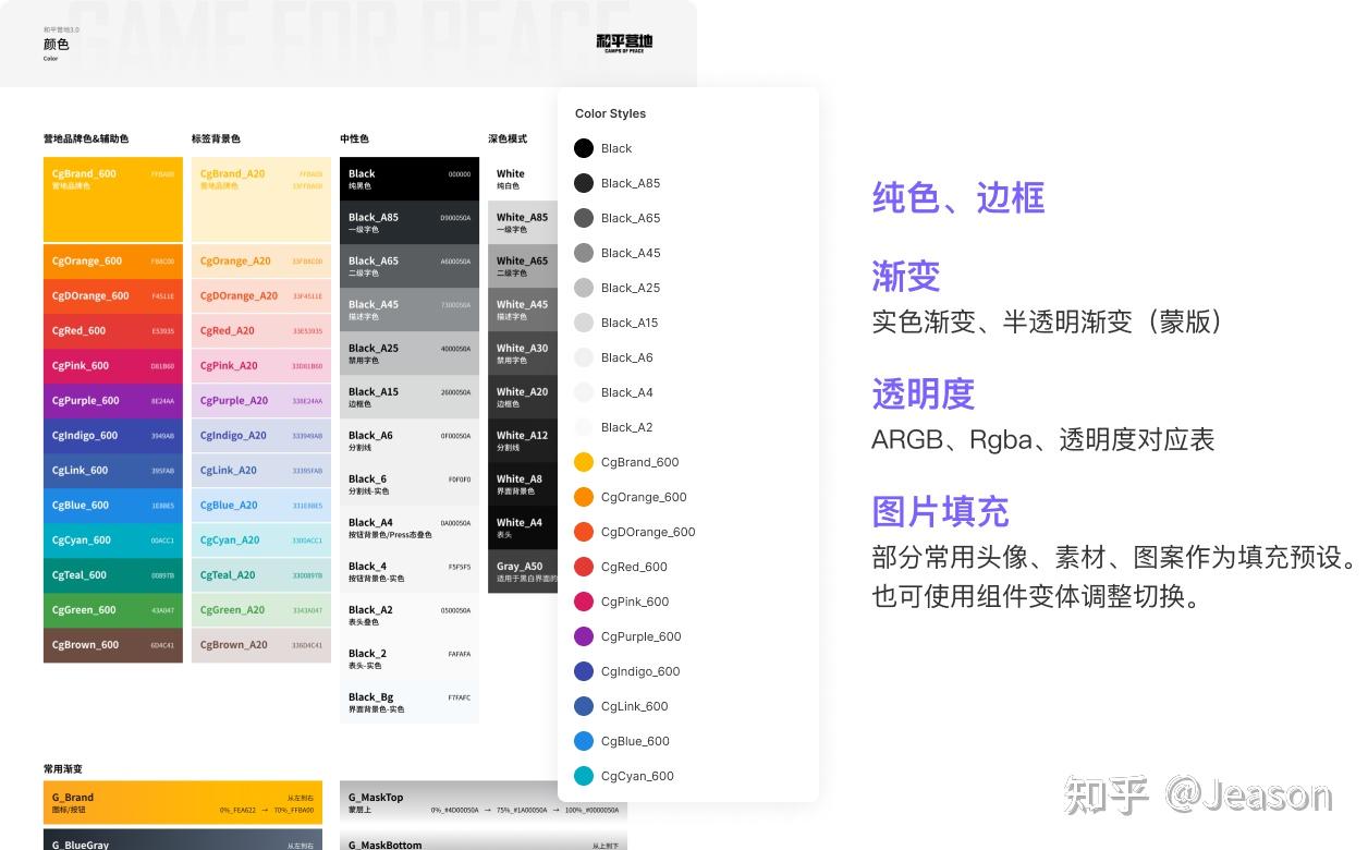 在营地中,颜色样式围绕品牌色,参考行业同行对对比度可读性的研究,进行一系列的 色阶处理。对常用的实色、渐变、半透明渐变(蒙版)以8位ARGB提供对应色值。形成一套深浅对应的中性色和彩色体系。