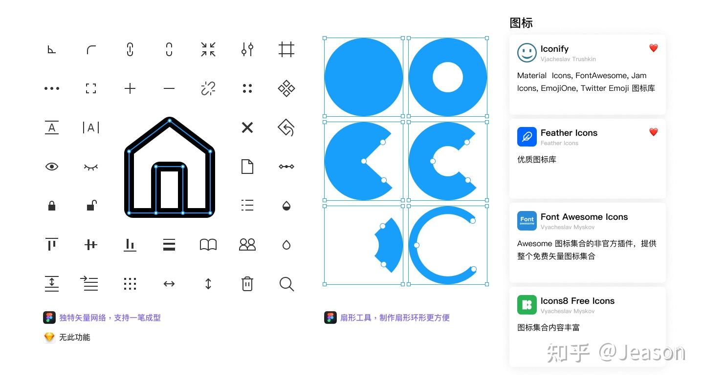Figma的图标绘制在 独有的矢量网格技术上,可以用一笔画完整个路径图标 ,可以在不同的方向直接分叉而不需要创建单独的路径对象。此外还可以使用 椭圆工具 创建形状如饼图、环状图等,极大地提高图标绘制的效率。