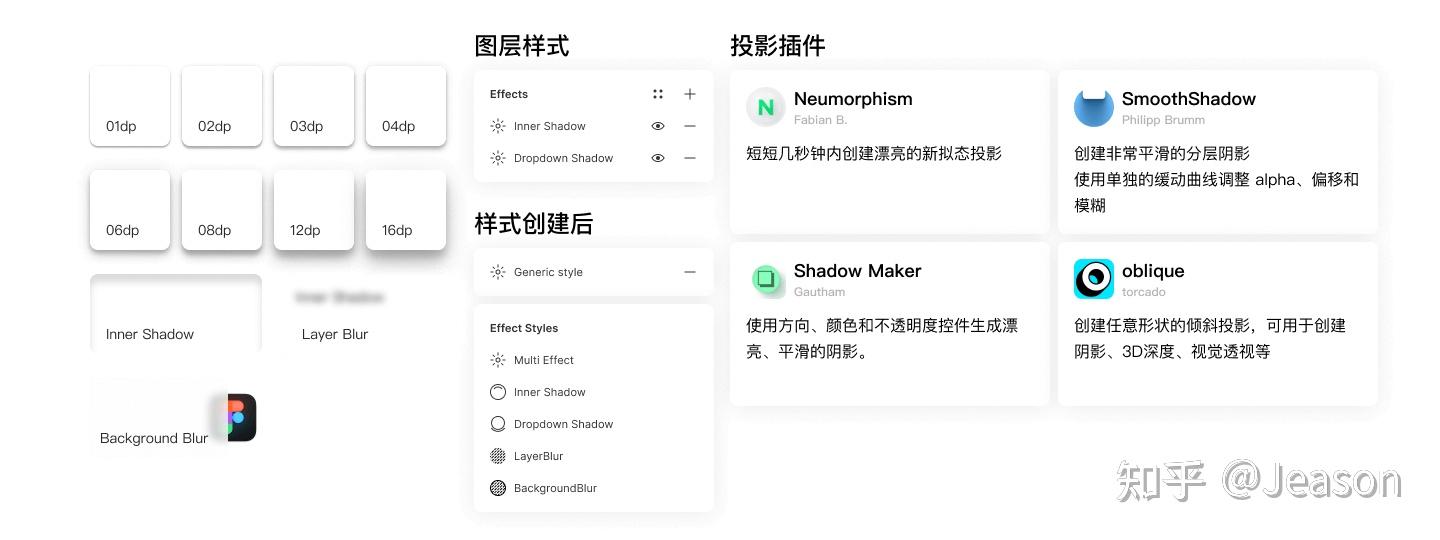 在构建图层效果样式的时候,可以借助如Neumorphism创建漂亮的新拟态投影、SmoothShadow创建平滑的分层阴影、oblique创建长投影等。