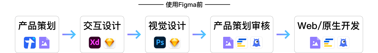 在使用Figma之前: 产品策划团队一般用Tapd、在线文档、原型图等描述需求,交互用XD、Sketch等梳理设计交互图,视觉同学用PS、Sketch等完成设计,最终以又以效果图、Codesign等交付给产品策划审阅定稿,最终Codesign等交付工具交付开发。