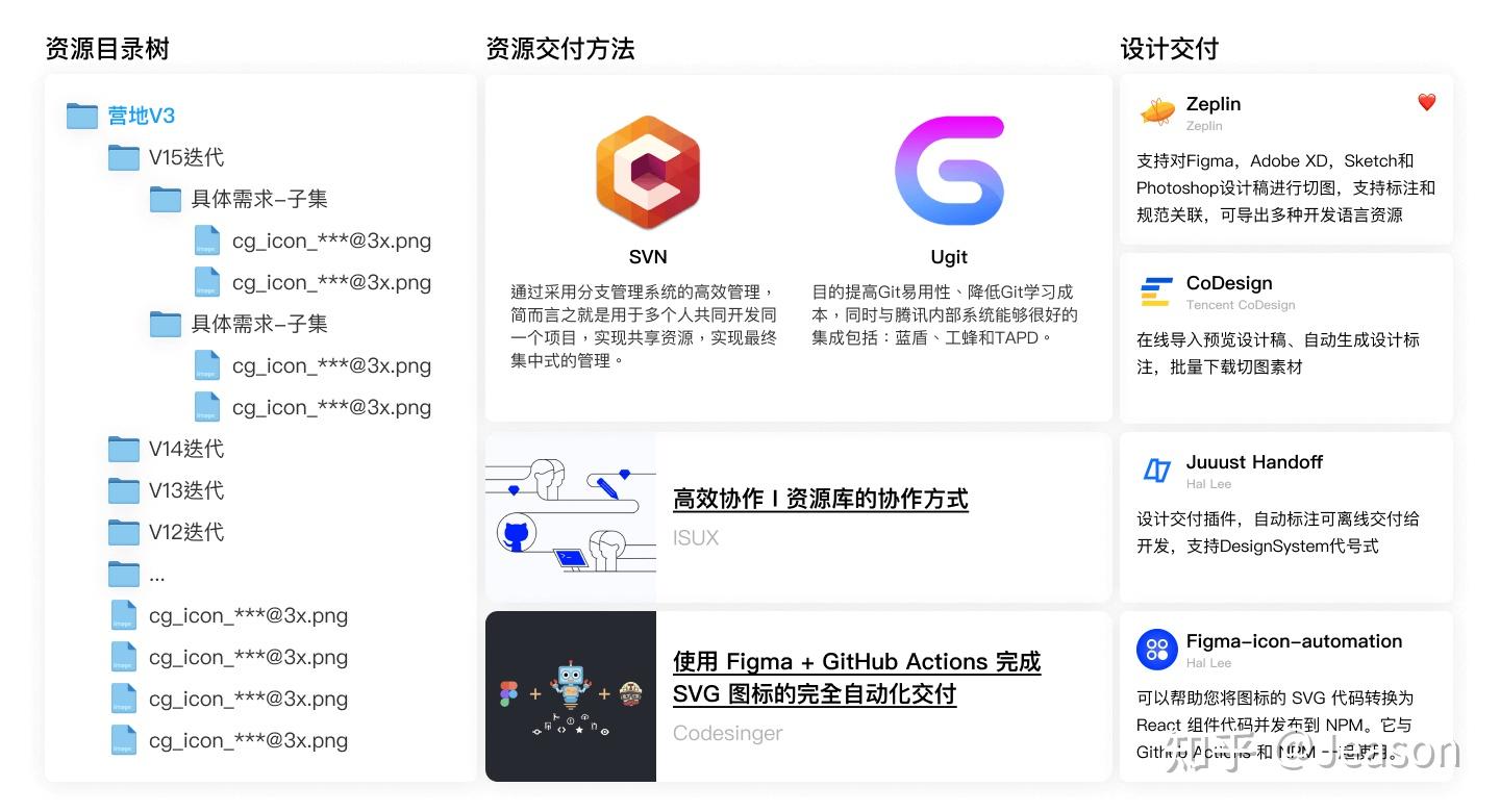 比较高级的方法可以参照《高效协作 I 资源库的协作方式》 【1】 、《使用 Figma + GitHub Actions 完成 SVG 图标的完全自动化交付》 【2】 。