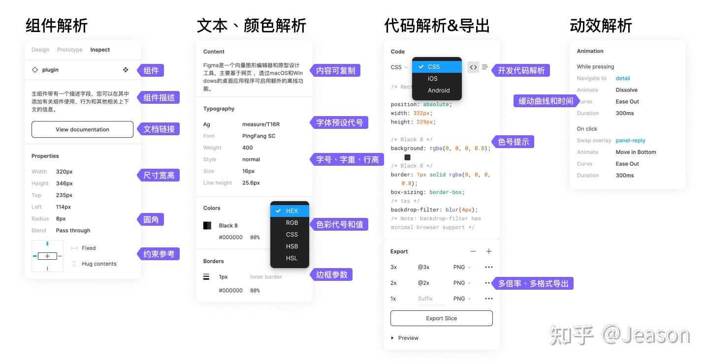 - 对文本、颜色的解析: 提供文本的复制、字体规范代号,字体、字重、字号、行高的解析,对颜色提供色号、不同的色彩模式、线框等(对自定义虚线没有直接实现的值,但是也能以SVG形式解析对应的Join、Cap、Dash pattern)