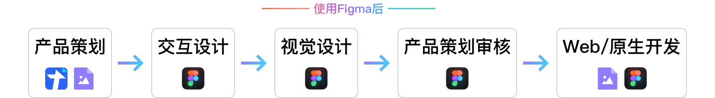 在使用Figma之后: 情况就可以完全不同了, 从交互设计到视觉设计,最后到策划审核和设计交付都可以在Figma上一站式完成,多人实时协作发挥了巨大的作用,更加敏捷了。