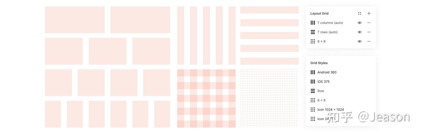 Figma支持建立栅格样式,现在你可以更愉快地在 每个界面,每个Frame里面自由地使用栅格样式 。完整的设计系统应该包含栅格系统, 可以自由组合水平、垂直、网格3种基本网格。